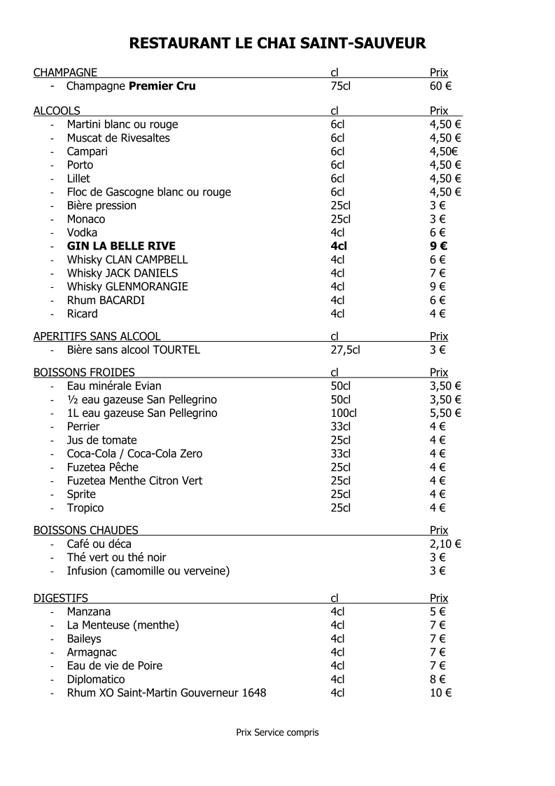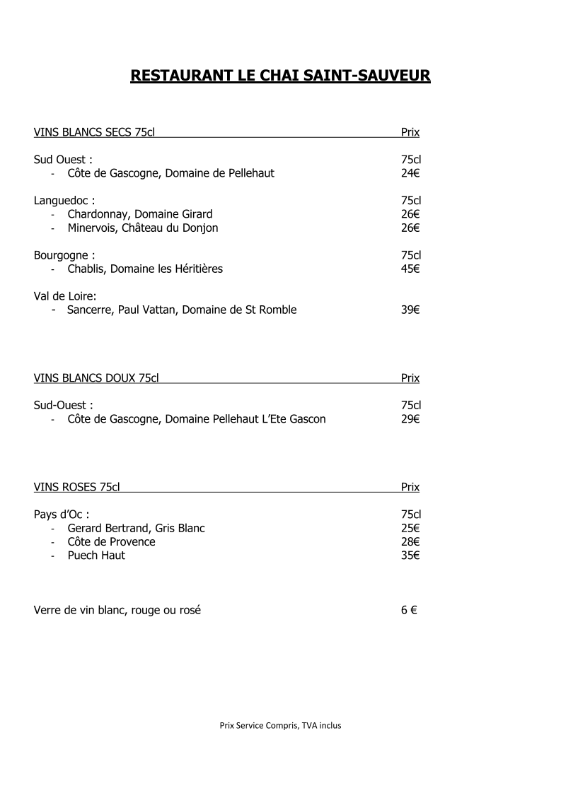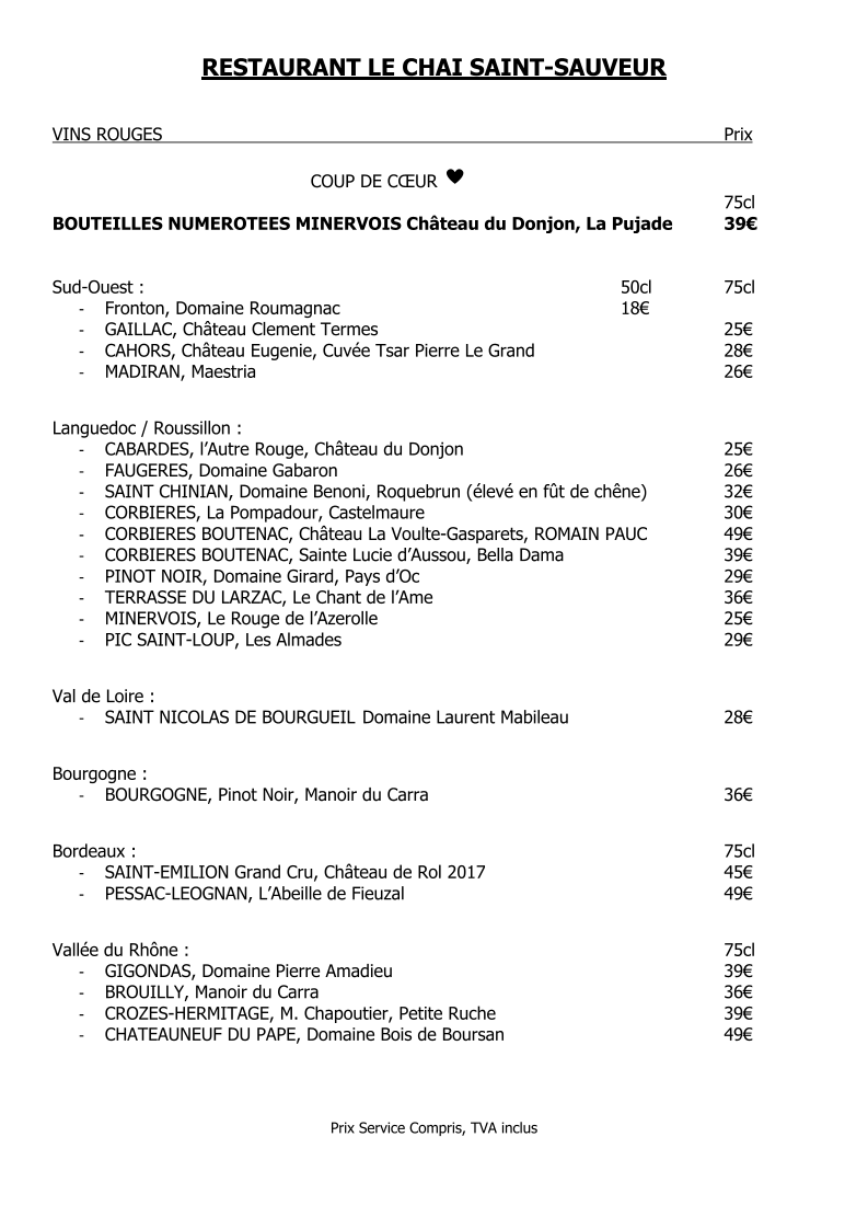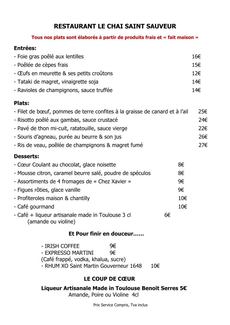 The menu at Le Chai Saint Sauveur offers a delightful variety of French cuisine, perfect for those seeking classic yet elevated dishes. The appetizers feature a mix of traditional and creative options, such as the rich and flavorful foie gras served with a delicate toast. For the main course, the standout dishes include the tender scallops, perfectly seared and accompanied by a light, citrus-infused sauce that enhances their natural sweetness. For dessert, profiteroles steal the show-light, airy choux pastries filled with a creamy vanilla filling and topped with a generous drizzle of warm chocolate sauce. Each dish on the menu showcases exceptional attention to detail, making it clear that Le Chai Saint Sauveur is dedicated to providing a memorable dining experience. The combination of expertly executed flavors and high-quality ingredients ensures that every meal is a special occasion.